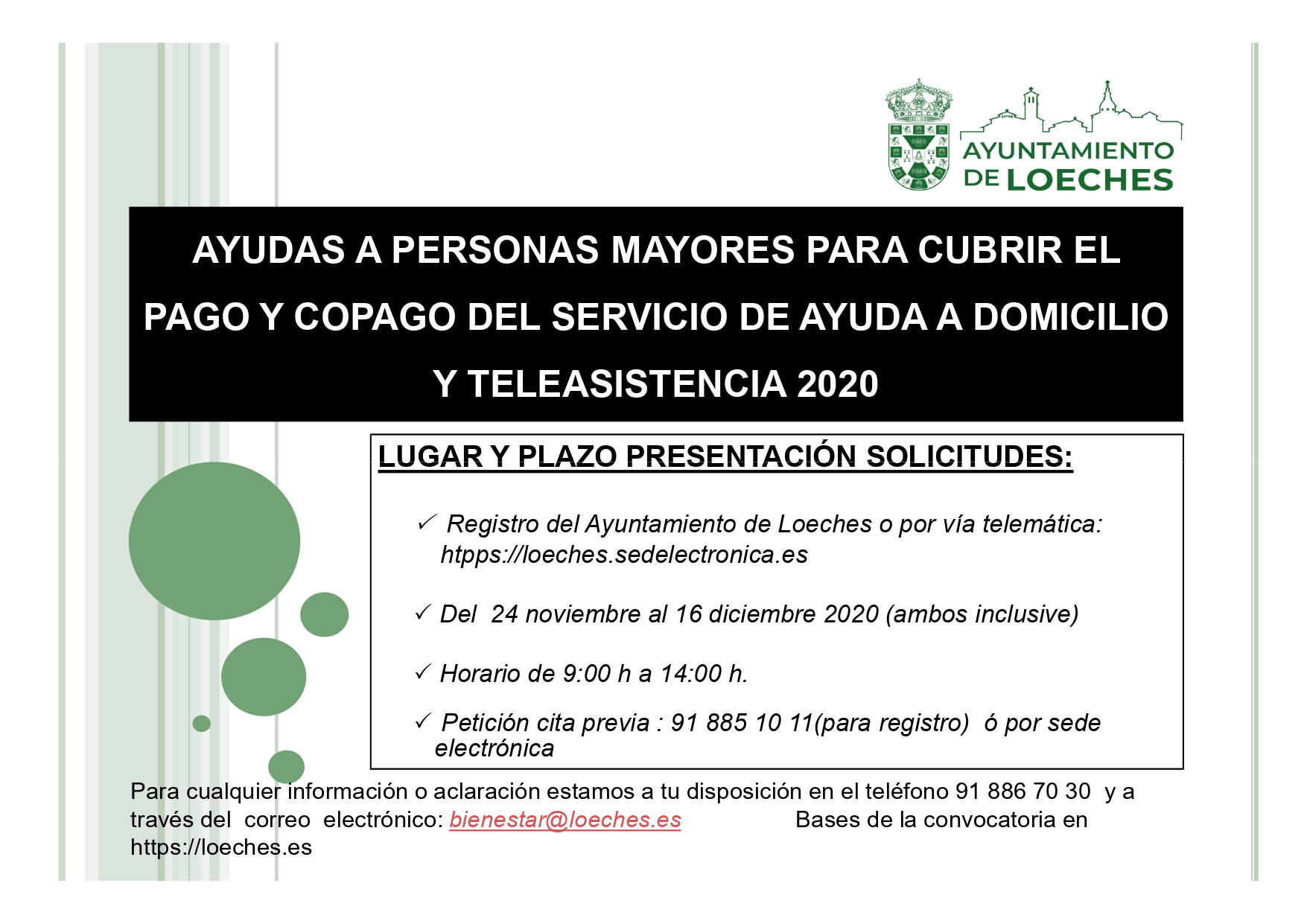 Para cualquier información adicional contacta con el Centro de Servicios Sociales en el teléfono 918867030 o escribe a la dirección de correo electrónico bienestar@loeches.es
