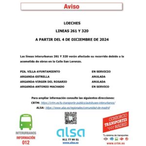 A partir del próximo miércoles día 4 se van a realizar obras en la Calle San Lorenzo que afectarán al tráfico rodado y a las lineas interurbanas 261 y 320, las paradas Arganda-Estrella y Arganda-Virgen del Rosario quedarán anuladas hasta que se pueda circular de nuevo por la Calle San Lorenzo, quedando en servicio para ambas lineas la parada Pza Villa-Ayuntamiento y Arganda-Antonio Machado, todas las demás paradas no afectadas siguen en servicio.