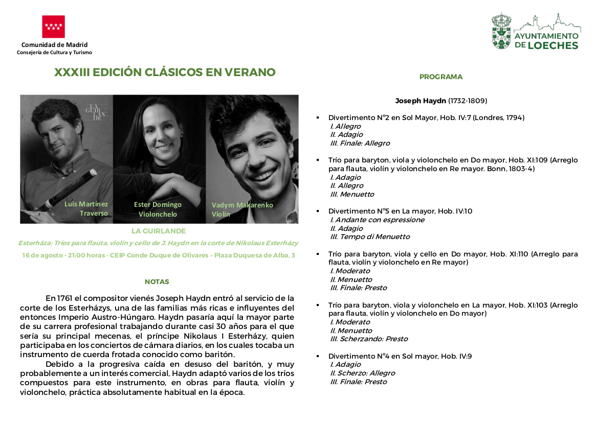 Para realizar la reserva de entradas, y poder disfrutar de la XXXIII Edición de los Clásicos en Verano, podéis escribir un correo electrónico a cultura@loeches.es, indicando en el asunto RESERVA DE ENTRADAS LA GUIRLANDE , y en el cuerpo del mensaje el nombre, apellidos y DNI, en su caso, de las personas convivientes que asistirán al concierto para facilitar su agrupación.